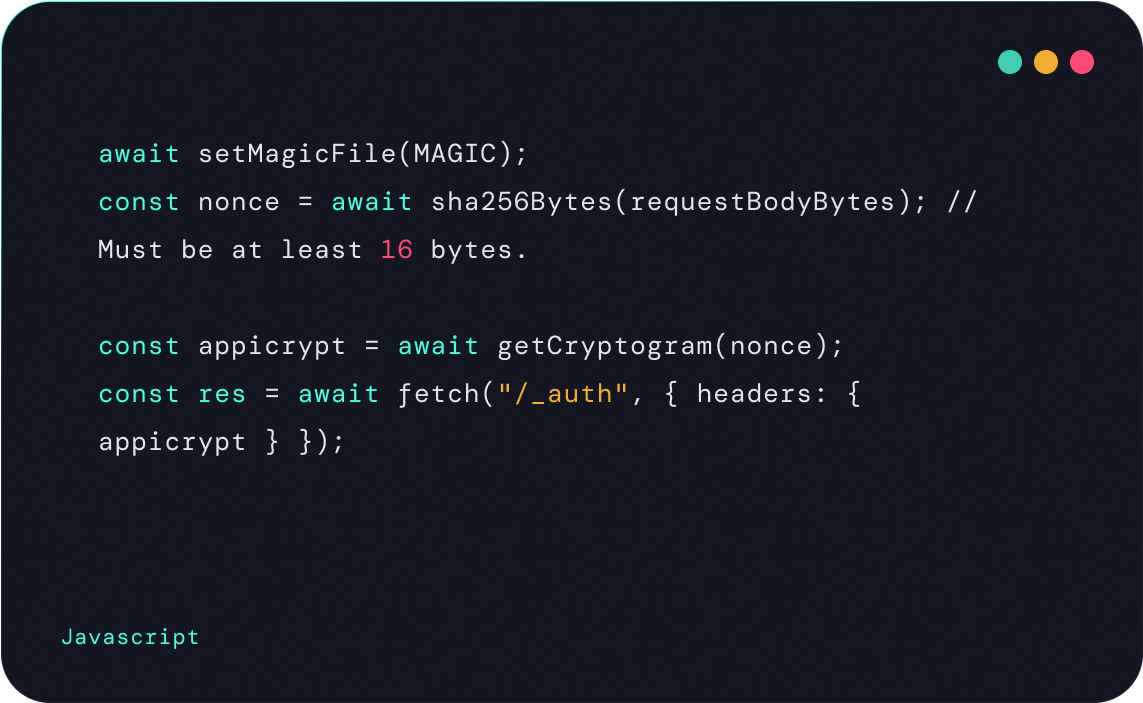A lightweight magic file bootstraps the system by delivering the necessary encryption material, policy configuration, and key identifiers. Developers initialize it once per app load: